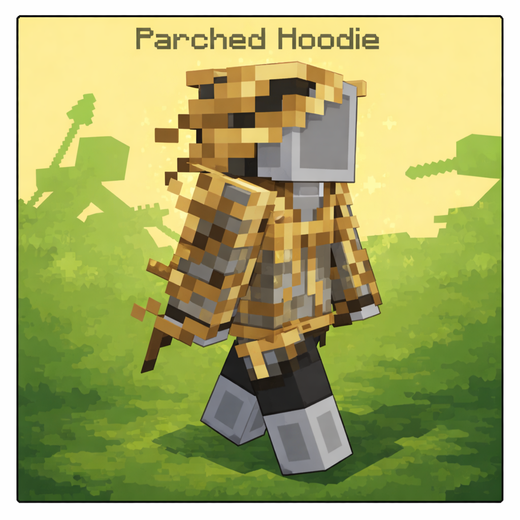 Parched Hoodie – Skin Áo Hoodie Khô Hạn là DLC độc đáo dành cho Minecraft, giúp người chơi nâng cấp ngoại hình nhân vật với phong cách sa mạc khô cằn đầy cá tính. Thiết kế hoodie với tông màu vàng nâu đặc trưng tạo cảm giác bụi bặm, mạnh mẽ và cực kỳ nổi bật trong thế giới Minecraft.